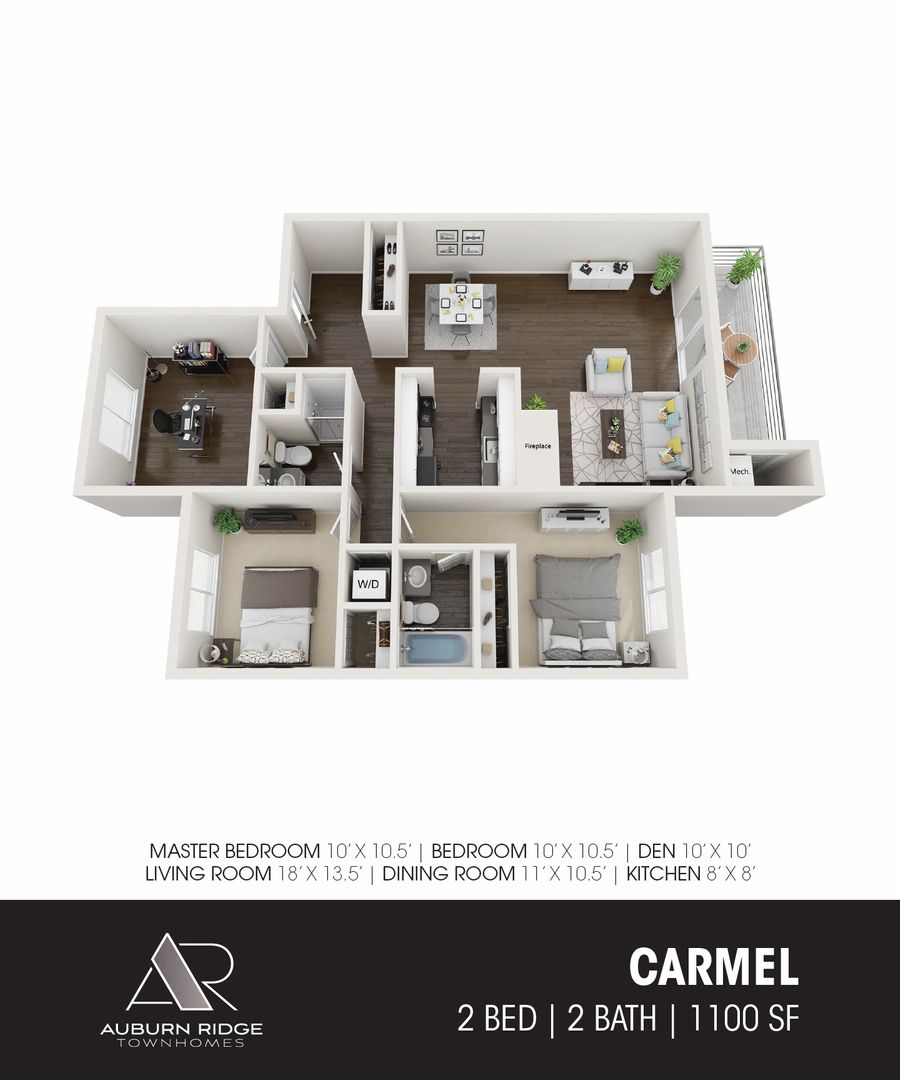 A private 1st floor entrance welcomes you to this huge 2 bedroom with a den townhouse. The townhouse is comparable to homes in the area with 1,100 sq ft of indoor living space and also includes a large patio. Updates include flooring, cabinetry, appliances and lighting! Every home comes with a washer and dryer, as well as a fireplace and carport!